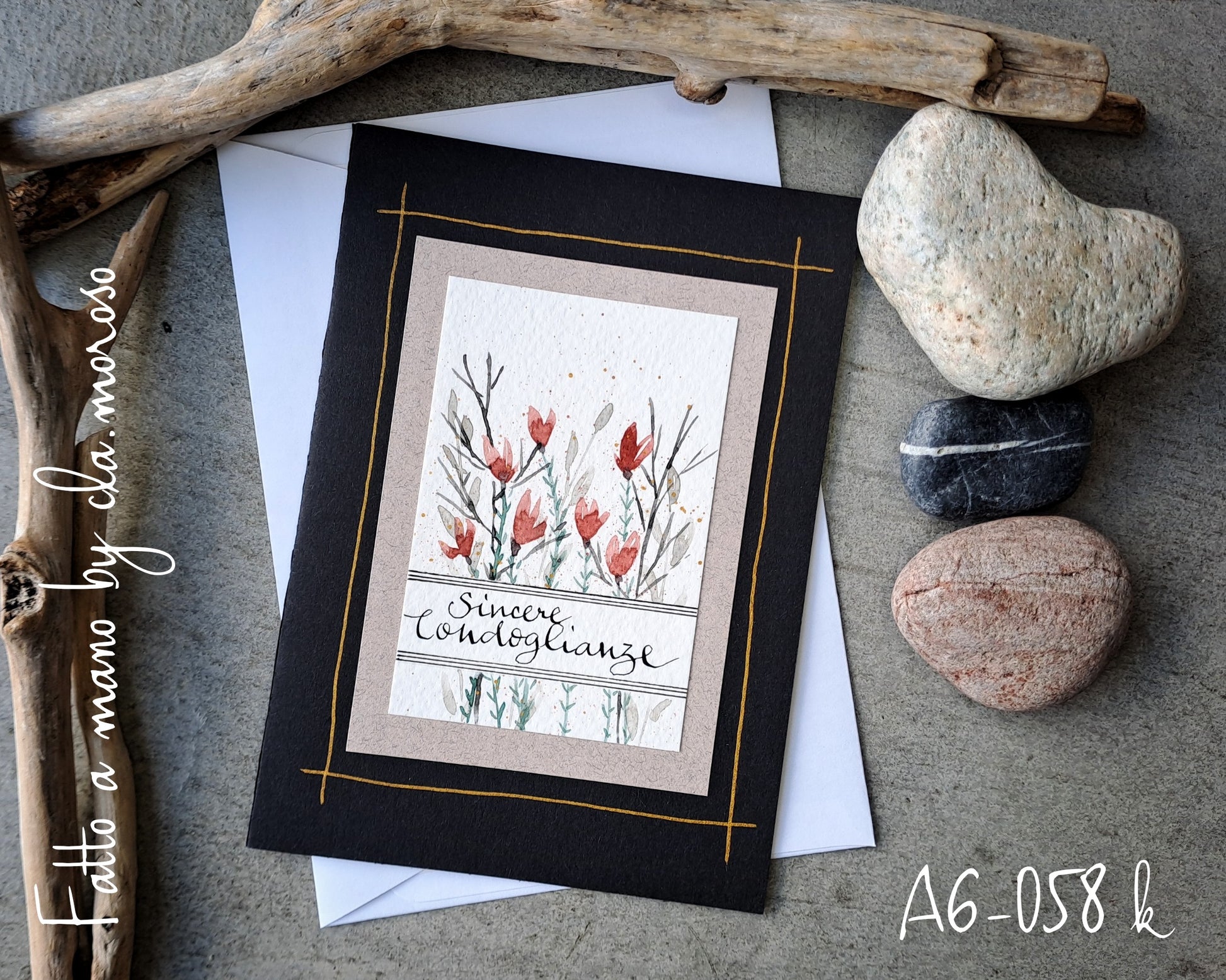Questo bigliettodi condoglianze doppio formato A6 (10,5 x 14,8 cm) in cartoncino pregiato e accompagnato da una busta, disegnato a mano con delicati acquerelli, offre un modo sobrio ed elegante per esprimere il proprio cordoglio. Ogni dettaglio realizzato a mano rende ogni pezzo unico, aggiungendo un tocco personale e rispettoso in momenti di grande sensibilità. Perfetto per trasmettere sentimenti sinceri con raffinatezza.