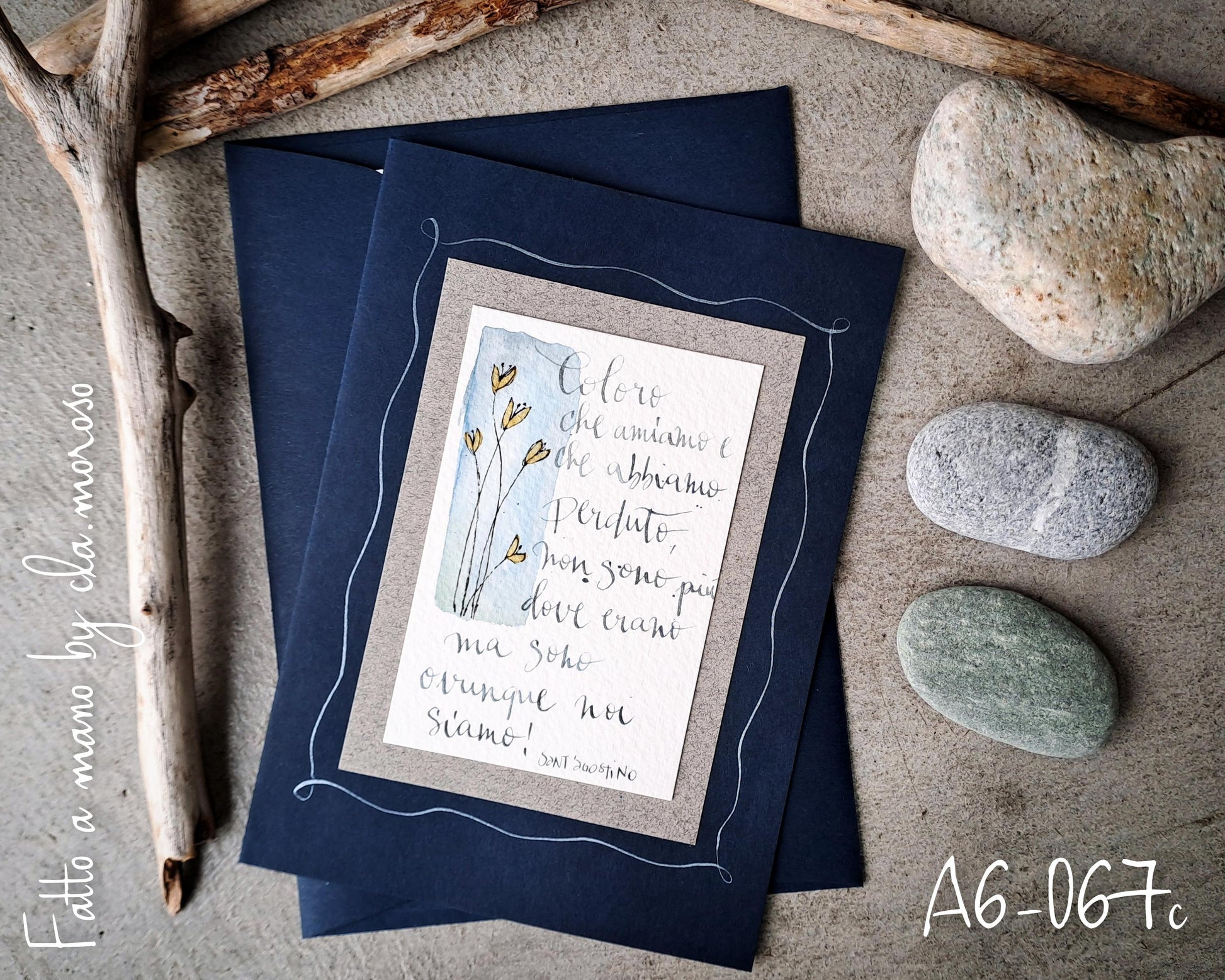 Questo bigliettodi condoglianze doppio formato A6 (10,5 x 14,8 cm) in cartoncino pregiato e accompagnato da una busta, disegnato a mano con delicati acquerelli, offre un modo sobrio ed elegante per esprimere il proprio cordoglio. Ogni dettaglio realizzato a mano rende ogni pezzo unico, aggiungendo un tocco personale e rispettoso in momenti di grande sensibilità. Perfetto per trasmettere sentimenti sinceri con raffinatezza.