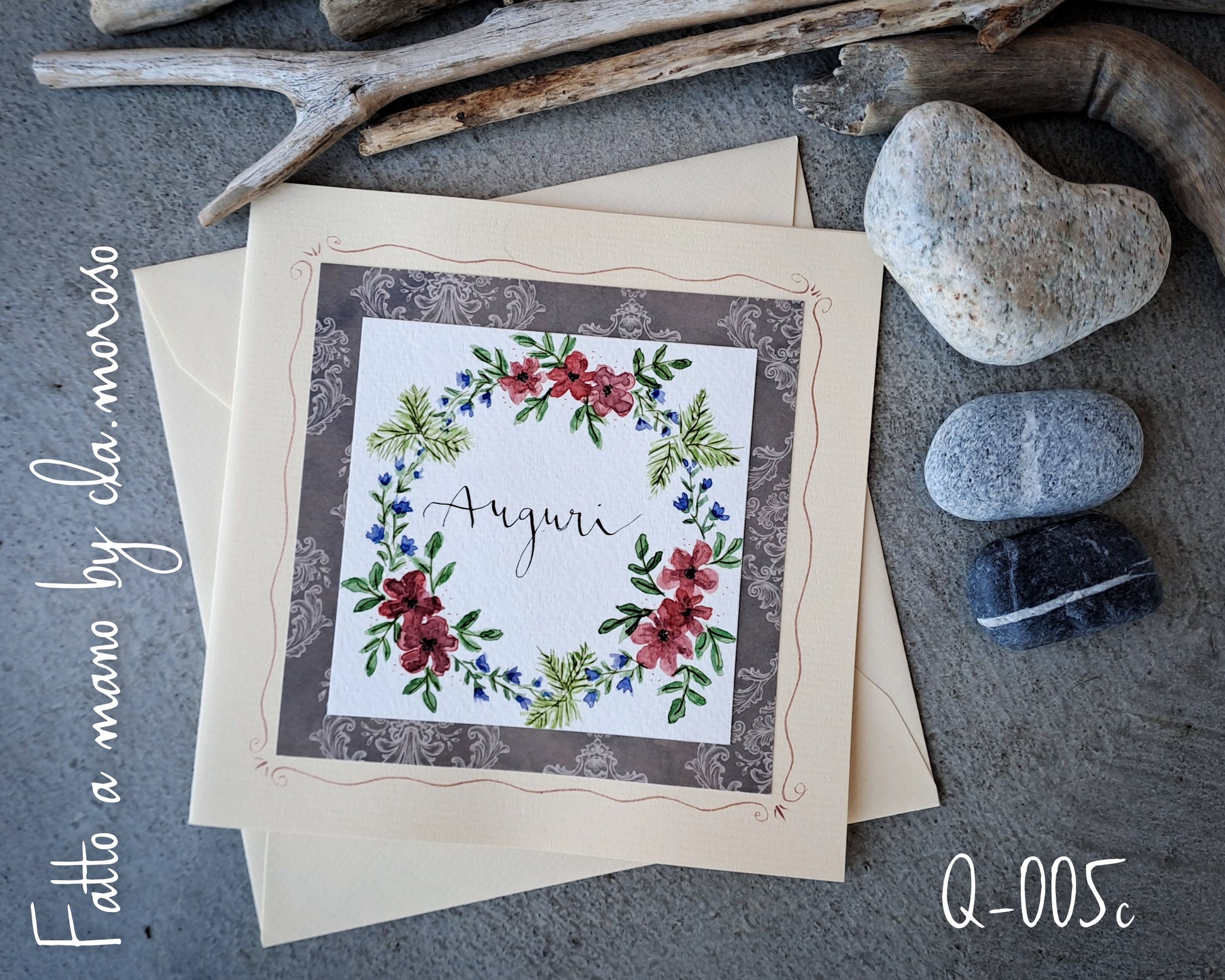 Questo biglietto doppio formato quadrato (14x14 cm ca) in cartoncino pregiato è accompagnato da una busta e presenta un disegno con corona floreale e scritta di auguri, realizzato a mano con acquarello e inchiostro. Ogni pezzo è unico, perfetto per regalare un sorriso con un tocco artistico e personale. Un modo simpatico e originale per condividere i tuoi messaggi speciali!