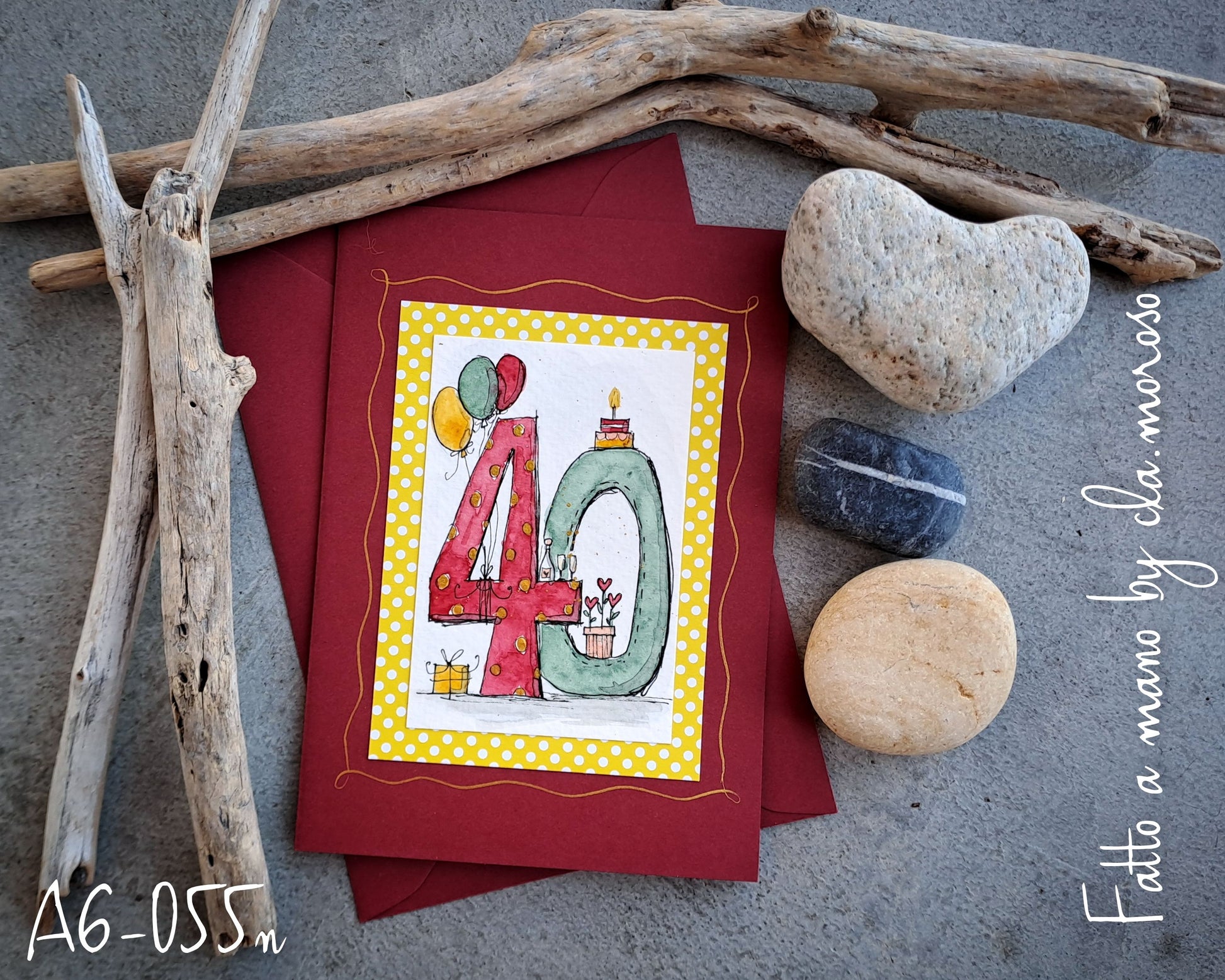 Questo biglietto doppio formato A6 (10,5 x 14,8 cm) in cartoncino pregiato è accompagnato da una busta e presenta un disegno che rappresenta una cifra tonda speciale, realizzato a mano con acquarello. Ogni pezzo è unico, perfetto per rendere ogni augurio di compleanno esclusivo e memorabile. Ideali per chi cerca un tocco colorato e originale in occasione di un anniversario importante!