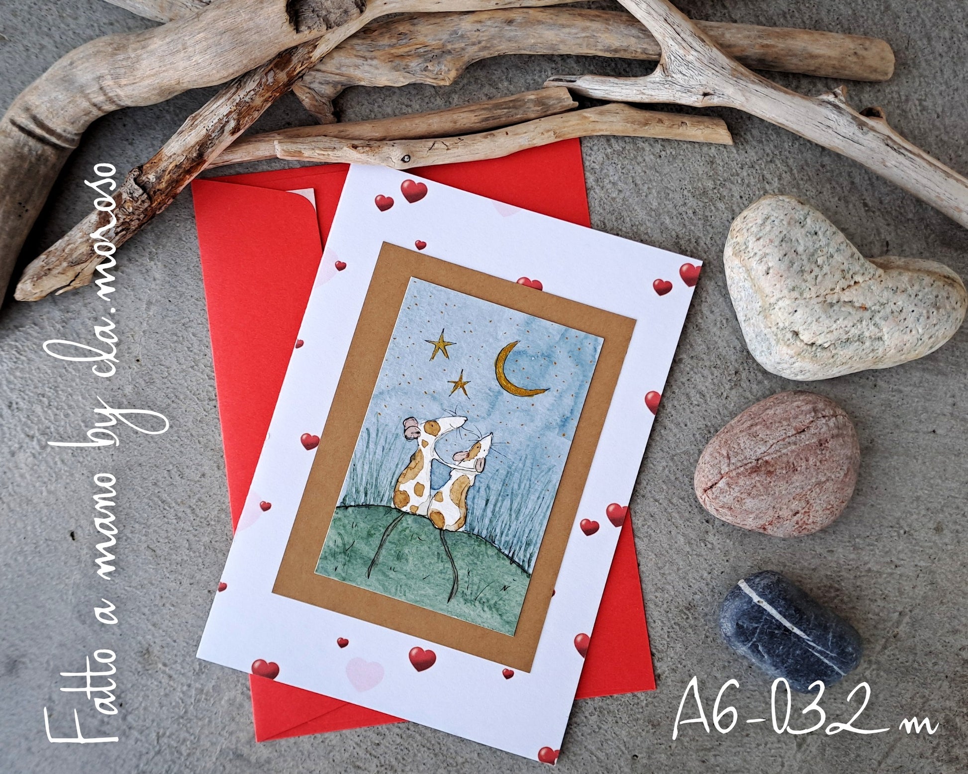 Questo biglietto doppio formato A6 (10,5 x 14,8 cm) in cartoncino pregiato è accompagnato da una busta e presenta un disegno di una coppia di topini realizzato a mano con acquarello e inchiostro. Ogni pezzo è unico, perfetto per regalare un sorriso con un tocco artistico e personale. Un modo simpatico e originale per condividere i tuoi messaggi speciali!