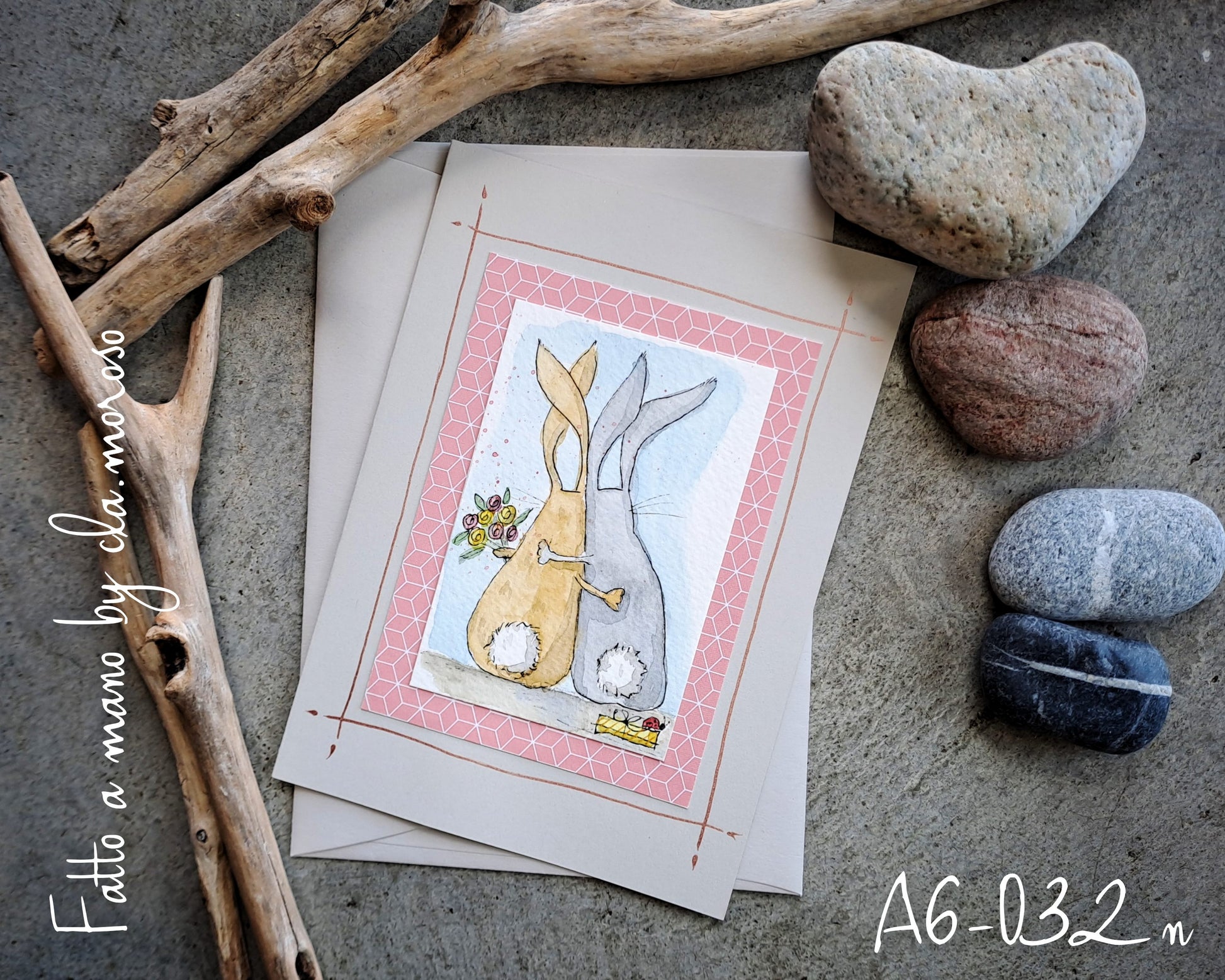 Questo biglietto doppio formato A6 (10,5 x 14,8 cm) in cartoncino pregiato è accompagnato da una busta e presenta un disegno di una coppia di coniglietti realizzato a mano con acquarello e inchiostro. Ogni pezzo è unico, perfetto per regalare un sorriso con un tocco artistico e personale. Un modo simpatico e originale per condividere i tuoi messaggi speciali!