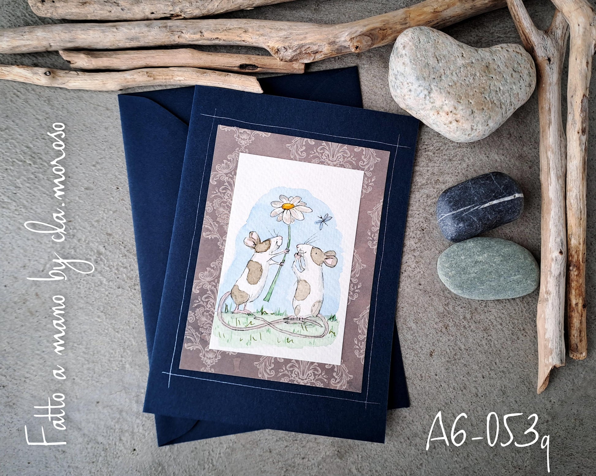 Questo biglietto doppio formato A6 (10,5 x 14,8 cm) in cartoncino pregiato è accompagnato da una busta e presenta un disegno di 2 topini con margherita, realizzato a mano con acquarello e inchiostro. Ogni pezzo è unico, perfetto per regalare un sorriso con un tocco artistico e personale. Un modo simpatico e originale per condividere i tuoi messaggi speciali!