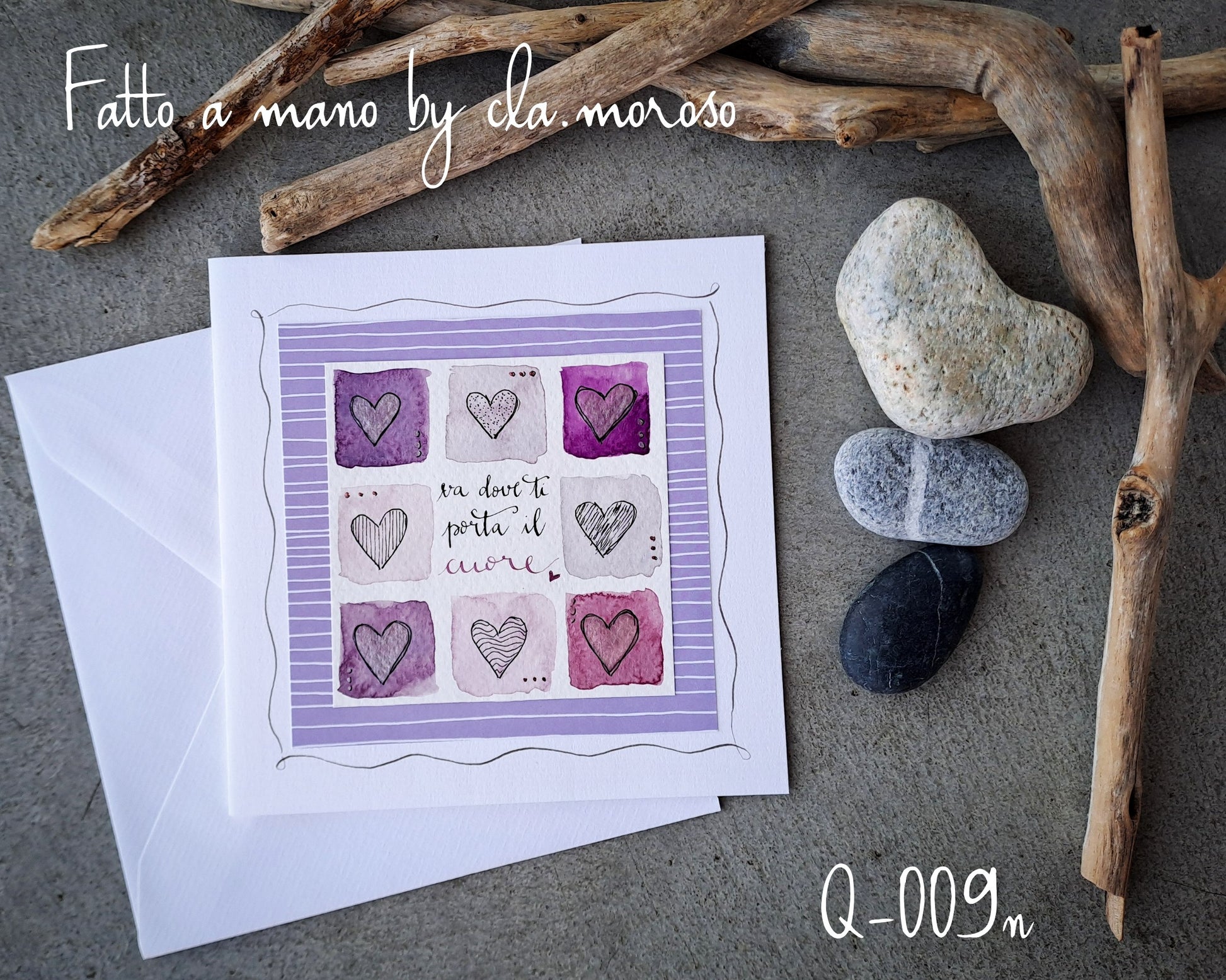 Questo biglietto doppio formato quadrato (14x14 cm ca) in cartoncino pregiato è accompagnato da una busta e presenta un disegno con 8 cuori e la scritta "va dove ti porta il cuore", realizzato a mano con acquarello e inchiostro. Ogni pezzo è unico, perfetto per regalare un sorriso con un tocco artistico e personale. Un modo simpatico e originale per condividere i tuoi messaggi speciali!