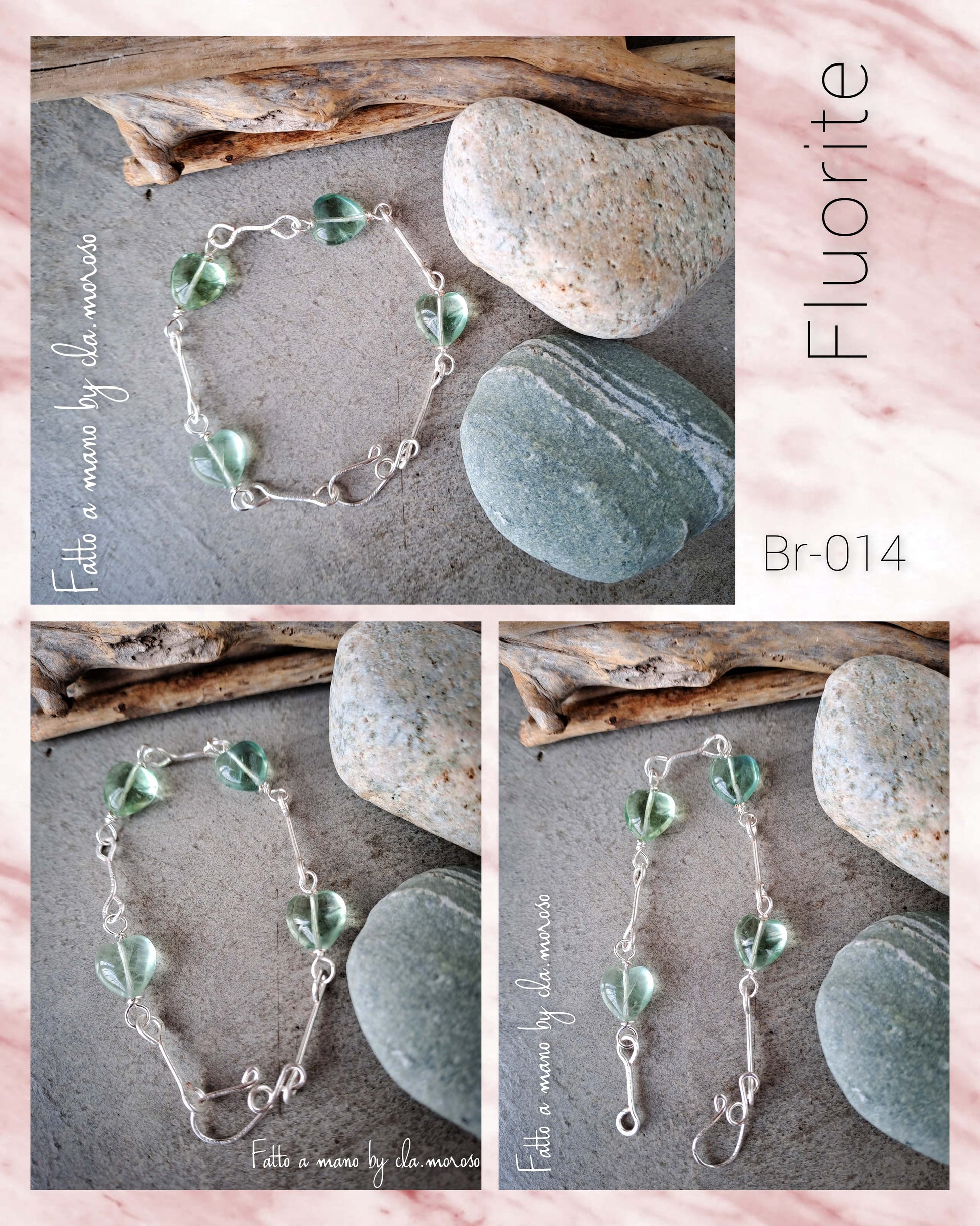 Braccialetto artigianale realizzato completamente a mano in rame argentato, impreziosito da quattro pietre in fluorite verde acqua a forma di cuore. La chiusura ad amo fatta a mano e l'anello di regolazione garantiscono una vestibilità personalizzata e confortevole (lunghezza 20-22 cm). Ogni elemento riflette l'unicità della lavorazione manuale, offrendo un accessorio di qualità che unisce funzionalità e raffinatezza estetica.
