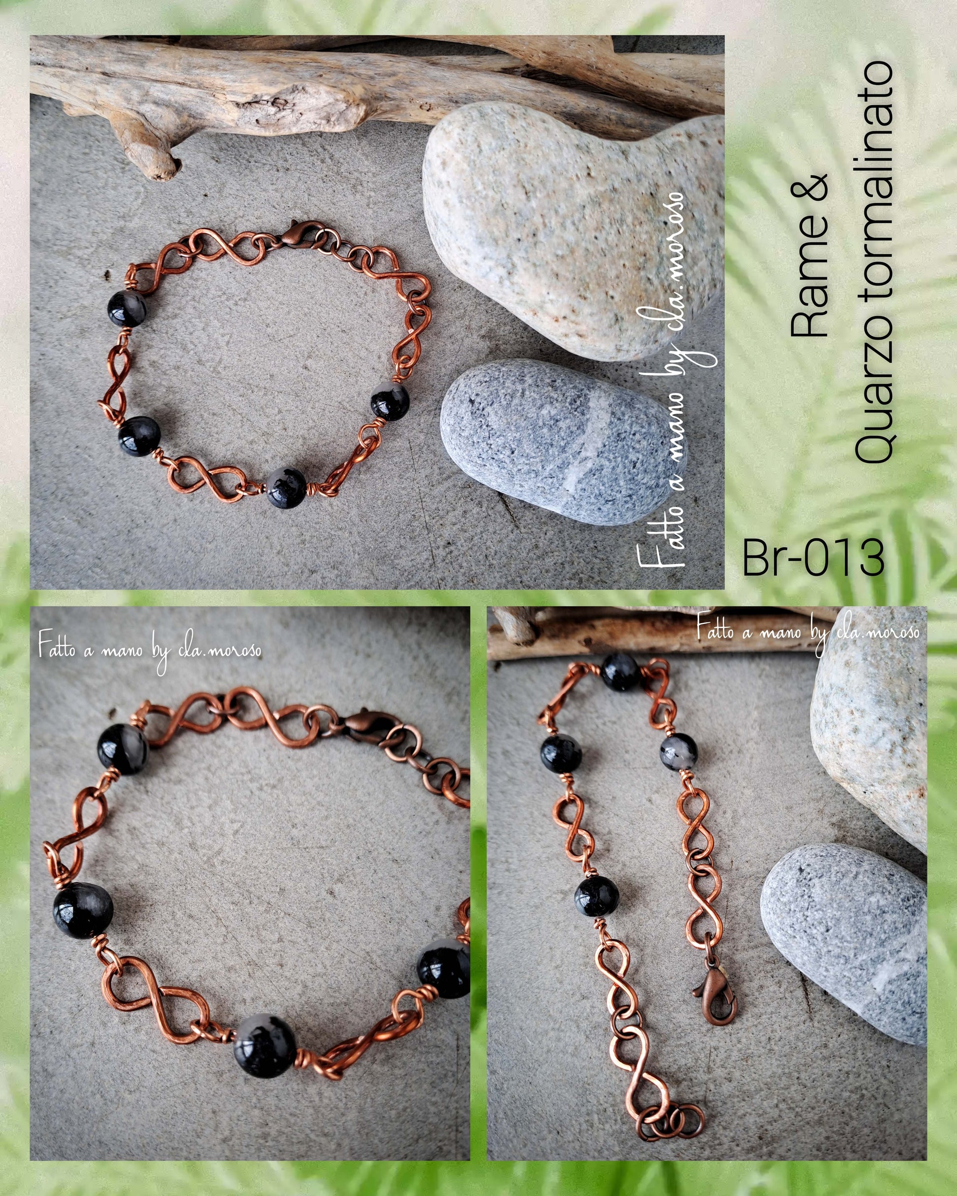 Braccialetto artigianale realizzato completamente a mano in rame, impreziosito da quattro pietre in quarzo tormalinato. La chiusura con moschettone e l'anello di regolazione garantiscono una vestibilità personalizzata e confortevole (lunghezza 18-20 cm). Ogni elemento riflette l'unicità della lavorazione manuale, offrendo un accessorio di qualità che unisce funzionalità e raffinatezza estetica.
