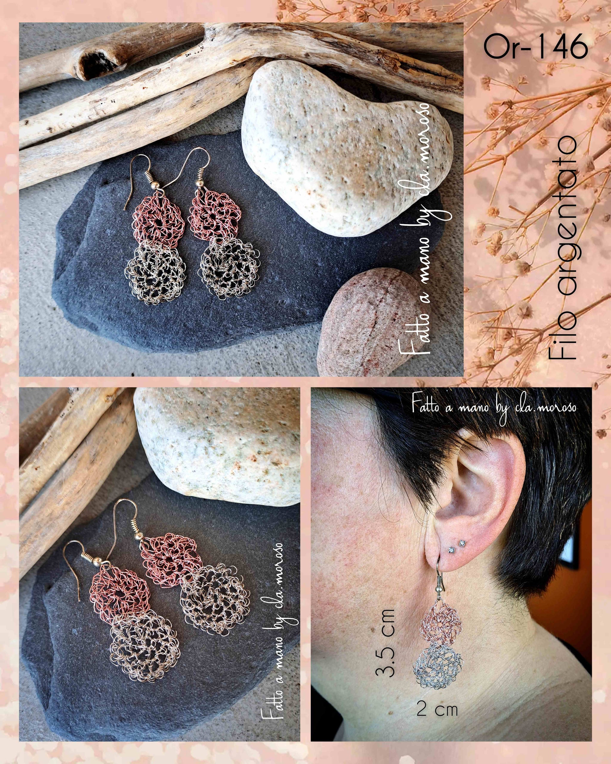 Orecchini a doppio disco realizzati a uncinetto con filo metallico colorato, di media grandezza (circa 2 x 3,5 cm). Progettati per essere visibili ma senza risultare eccessivi, offrono un equilibrio perfetto tra stile e sobrietà. La monachella ad amo è senza nichel, assicurando un comfort ottimale anche per le pelli più sensibili. Ideali per chi cerca un accessorio artigianale raffinato e leggero.