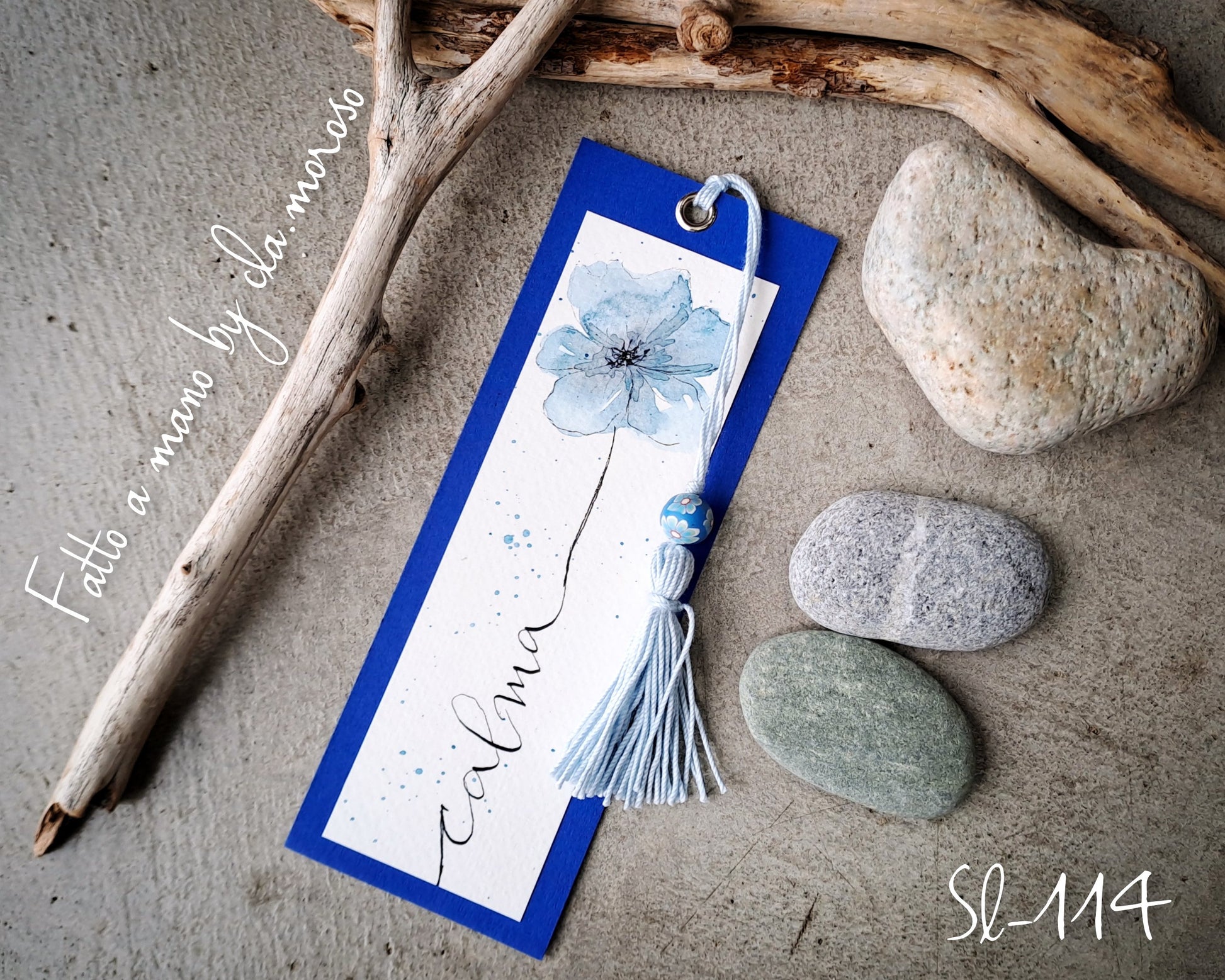 Questi segnalibri blu "calma" in cartoncino combinano l’arte della cromoterapia con un design raffinato: un delicato fiore dipinto ad acquarello valorizza ogni pezzo, mentre un ciuffo con perlina offre un dettaglio elegante e tattile. Ideali per chi cerca un accessorio che unisca estetica e benessere, aiutano a evocare tranquillità durante la lettura.