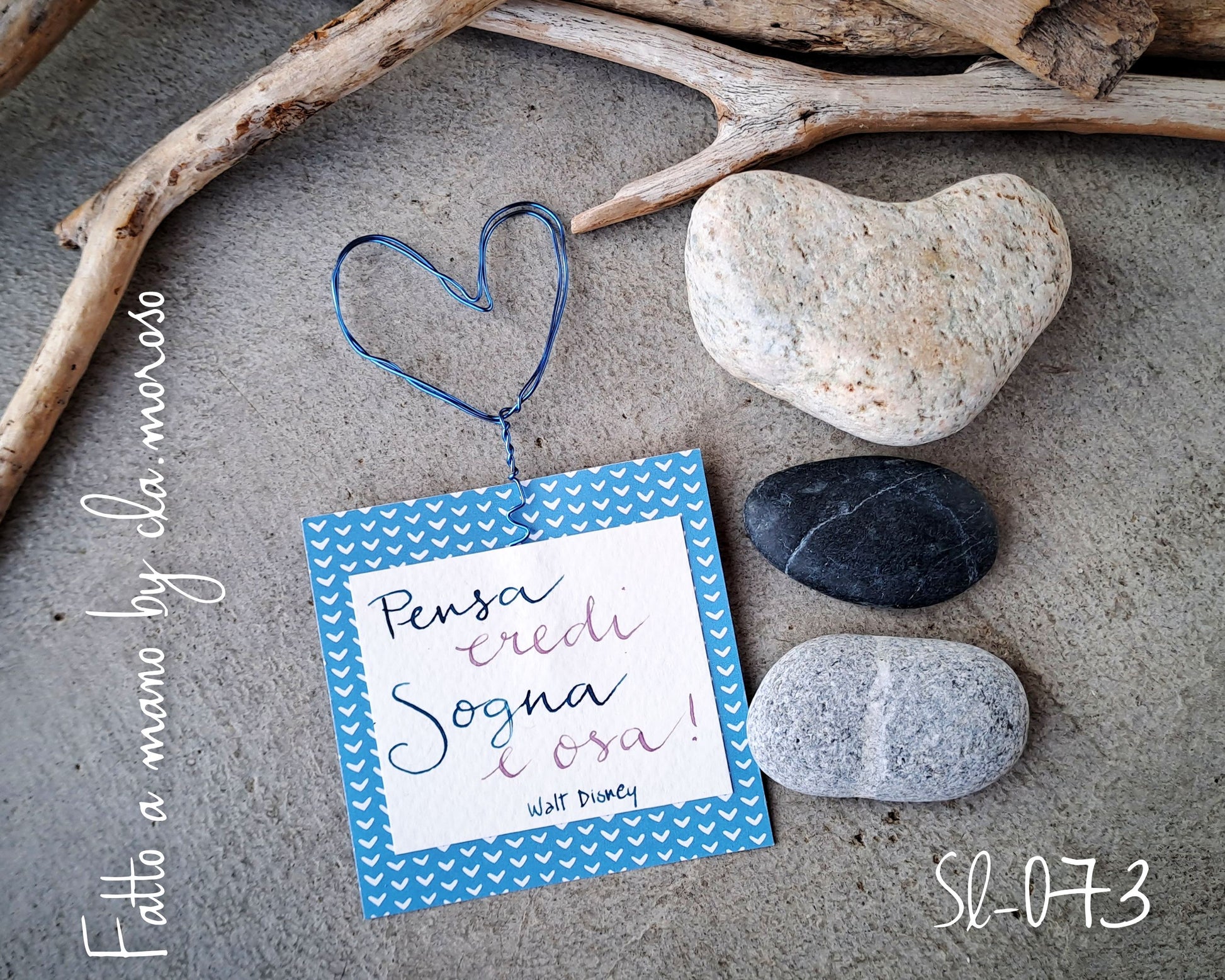 Questo segnalibro artigianale, realizzato in cartoncino colorato di dimensioni 7x14 cm, presenta una citazione ispirante che accompagna ogni pagina. Il dettaglio distintivo è il cuoricino in filo di ferro blu, che aggiunge un elemento originale e raffinato, trasformando ogni pausa di lettura in un momento speciale.